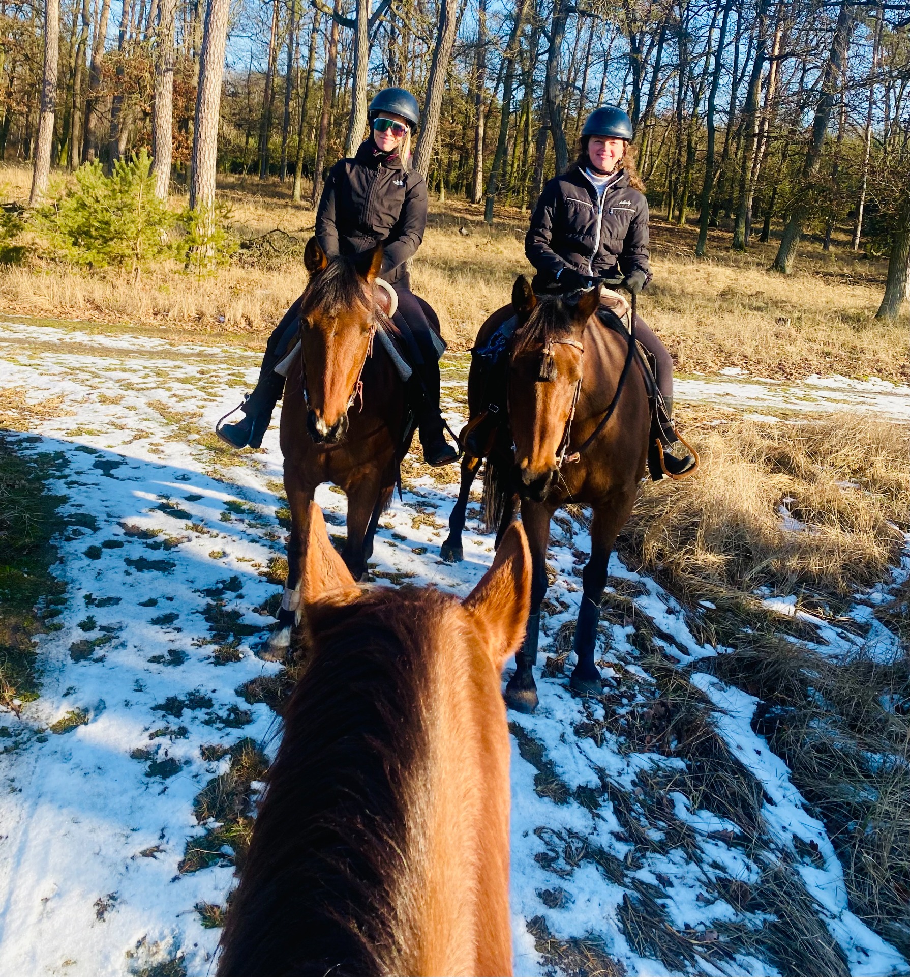 Zimné vychádzky majú zvláštnu mágiu. Dnes to bolo presne ono — slnko sa opieralo do stromov, ale vzduch bol chladný, čistý a bezvetrie spravilo z lesa úplné ticho. Sem-tam ešte zostatkový sneh na okraji cesty, ale inak bolo cítiť, že príroda spí hlbokým spánkom. Žiadne srnky, žiadne pohybujúce sa tiene medzi stromami… len my, kone a les.