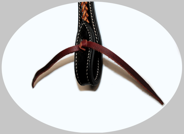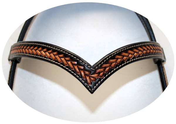 Štýlová westernová uzda typu stirnband (browband headstall) v show prevedení s dekoratívnym pleteným detailom na čelenke, ktorý dodáva výstroji výrazný westernový charakter.