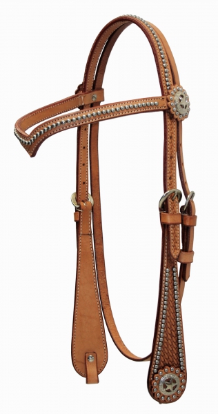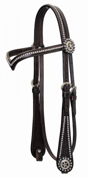 Westernová uzda typu V stirnband (V-čelenka) v show prevedení s dekoratívnymi kovovými prvkami (spots) a dostupná v troch farebných variantoch.